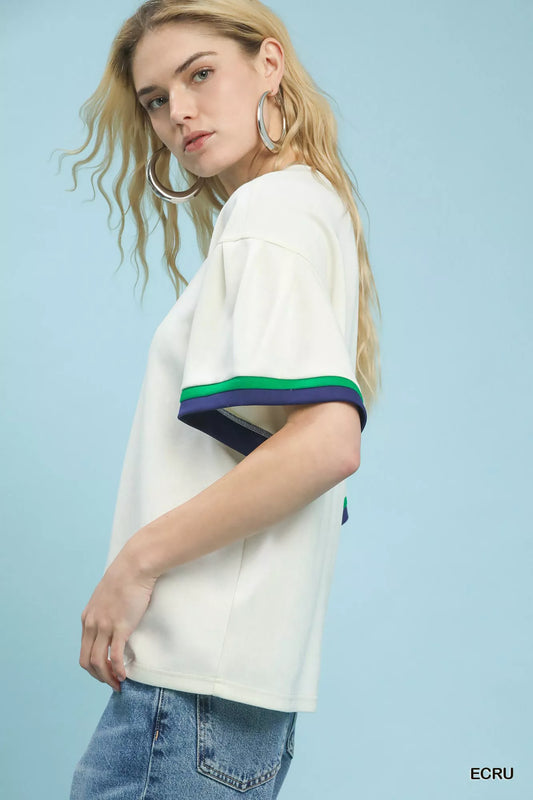 Umgee Zip Front Casual Top with Contrast Stripe Trim