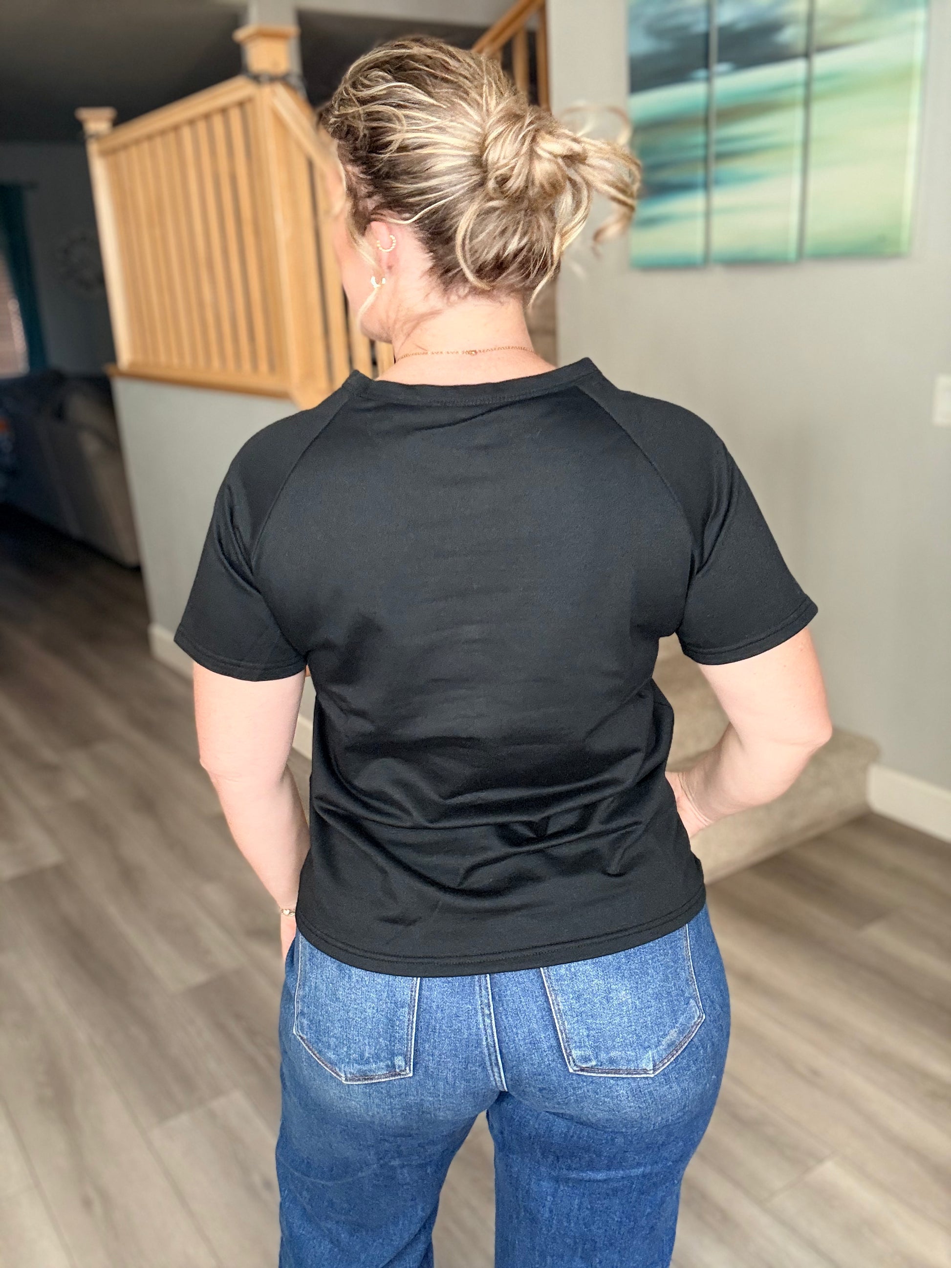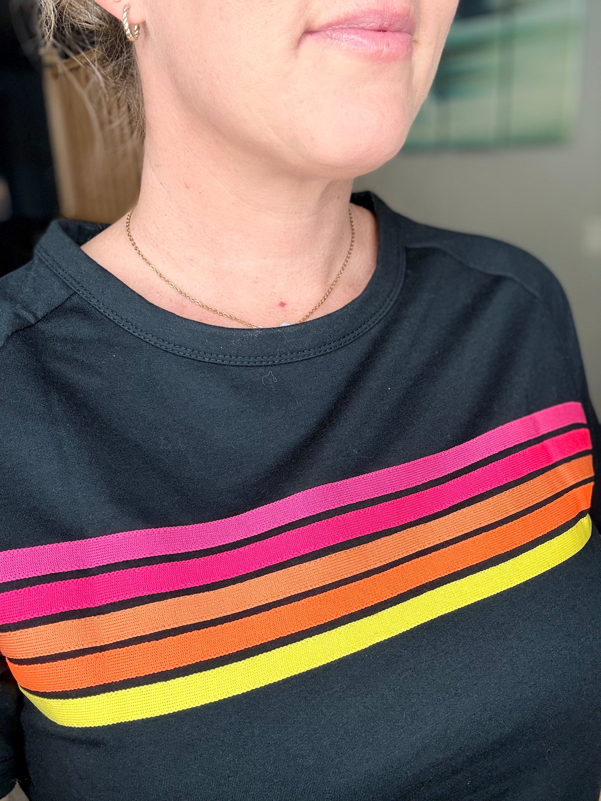 Black tee with retro, multi-colored stripes and a slim, unisex fit. Thicker material gives this top a great structure while maintaining max comfort. Fits TTS